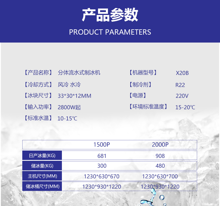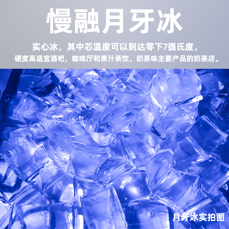 产品简介:产量大,制冰快,适合多种场合。品牌压缩机,制冷快,节能环保,噪音低。密封全发泡保温层,加厚发泡料,防止冷气外露,阻隔热量进入,可保持箱体内冰块不易溶化。智能,省电,感应快,方便易用。