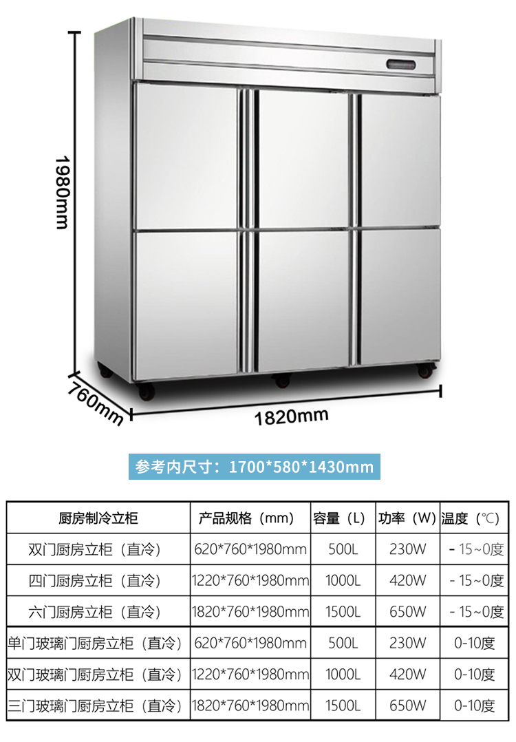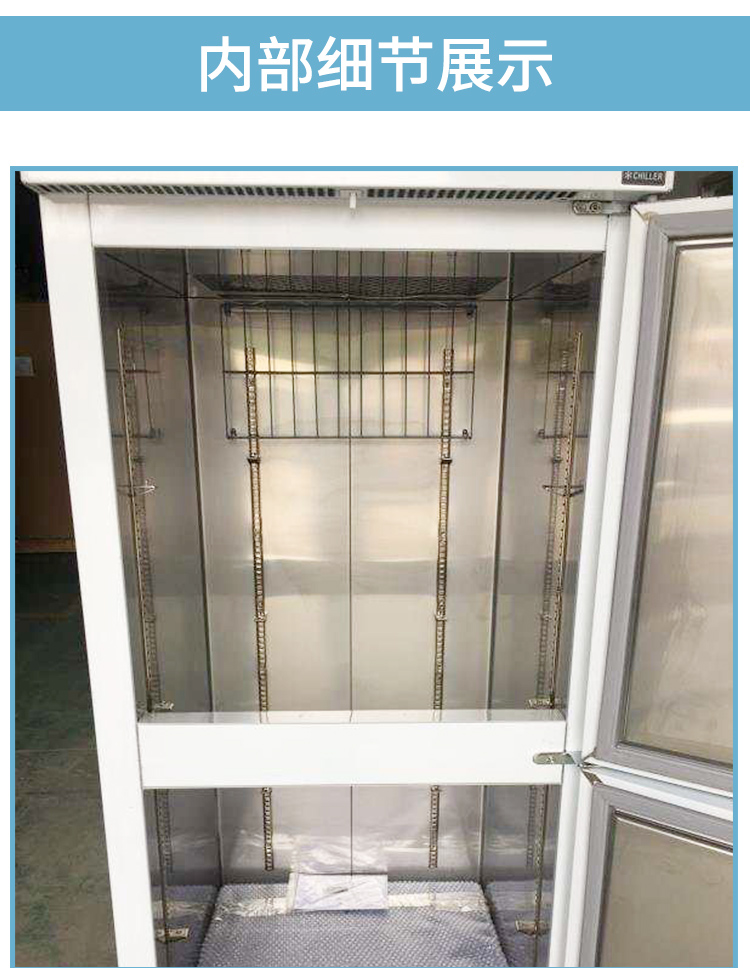 产品简介:产品特点 质量可靠,制冷效果强劲,内部主要制冷配件原装进口,性能稳定制冷效率高,环境温度在43度时仍能正常工作。 选用优质不锈钢板材、坚固耐用,内外均采用圆角设计,使产品外观更加高档内部易于清理。 风冷式制冷系统,保持箱体内空间温度均衡,并且无冷凝水和结冰现象。 采用自动回归门,球状磁性密封条,可减少不必要的能量流失,确保能够高效使用和保证食品安全,门封条更换方便,使用寿命达两年以上。 电子温控系统,自动除霜,可进行1度精确控温,并保持箱体内温度正负2度以内,每天4次每6小时自动除霜1次,保持箱体内温度均衡。 优化内部空间,增大存储空间,采用吸顶式蒸发器,充压式气流强排风使柜内温度均衡同时拥有更大的存储空间。 环保、节能,采用R134和R404环保冷媒,不增加大气层污染,同时采用最节能的制冷系统保证以最低的能耗运行,不增加客户的额外负担。